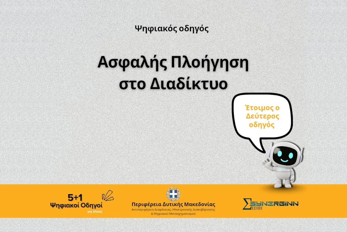 Μετά και την ιδιαίτερα θετική ανταπόκριση που είχε ο πρώτος οδηγός της σειράς με θέμα τις Χρήσιμες Συμβουλές για το gov.gr, η Περιφέρεια Δυτικής Μακεδονίας παρουσιάζει τον δεύτερο οδηγό της σειράς «5+1 Ψηφιακοί Οδηγοί για Όλους» με τίτλο «Ασφαλής Πλοήγηση στο Διαδίκτυο».