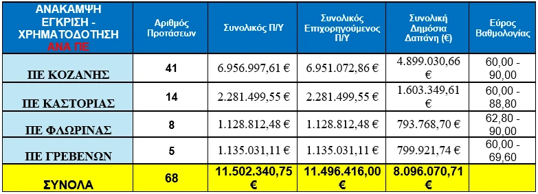 - 68 προτάσεις εγκρίθηκαν για χρηματοδότηση, με συνολικό επιχορηγούμενο Π/Υ 11,50 εκ. € και δημόσια δαπάνη 8,10 εκ. €.